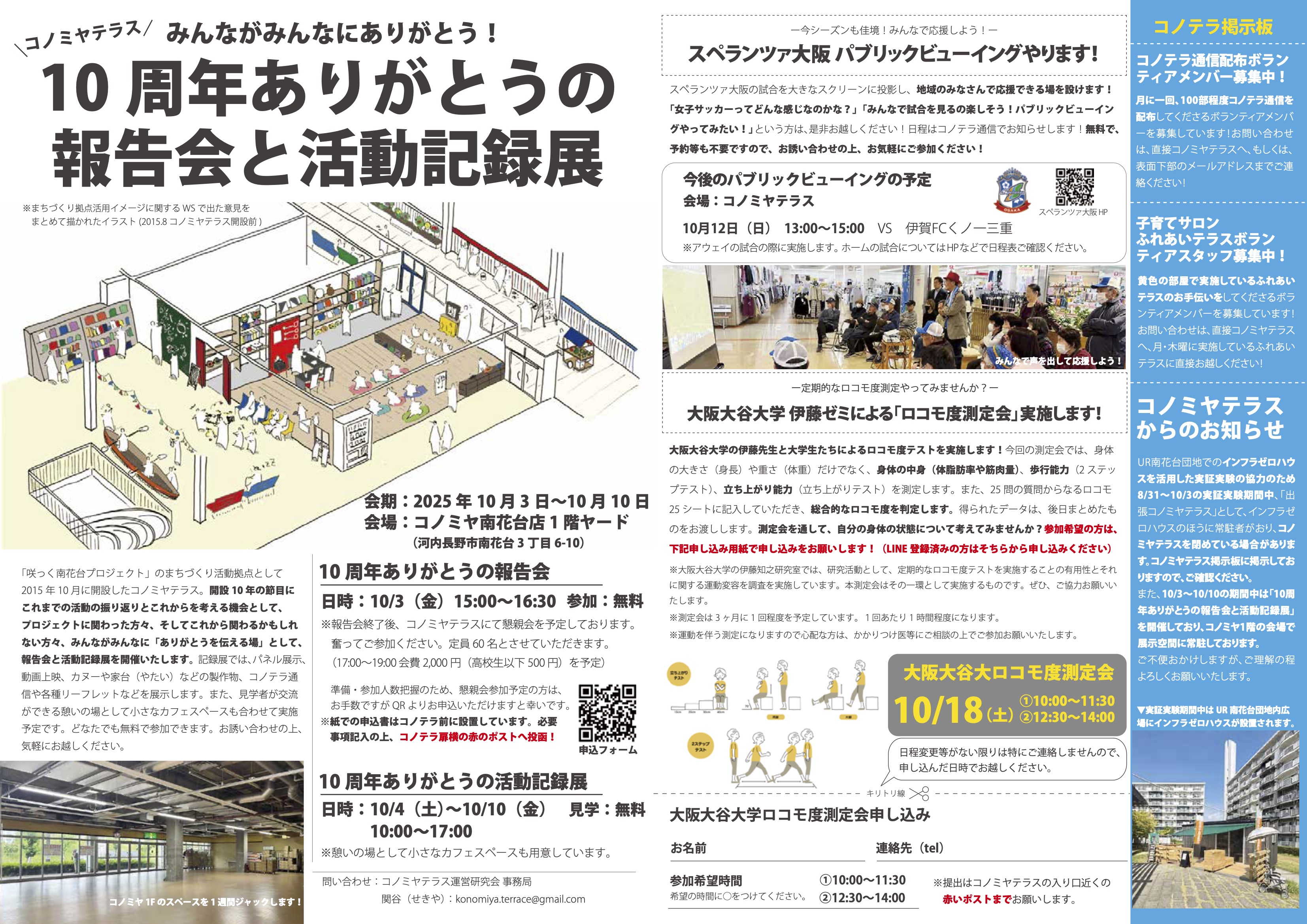 コノテラ通信vol.99 10月号発行! コノミヤテラスの情報を見る コノテラ通信発行! 10/3〜10/10まで、コノミヤテラス10周年企画として「10周年ありがとうの報告会と活動記録展」を実施します!詳細は記事をご確認ください! コノミヤテラス
