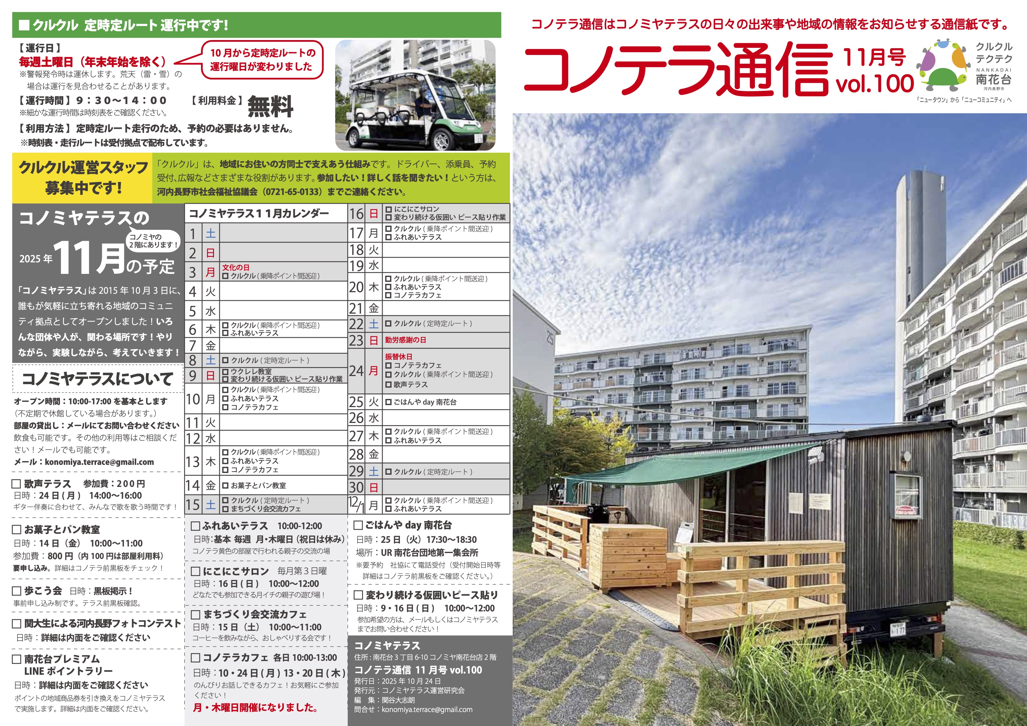現在配布中のコノテラ通信11月号において、クルクル定時定ルート運行日に誤りがありましたので、お詫びして訂正いたします。